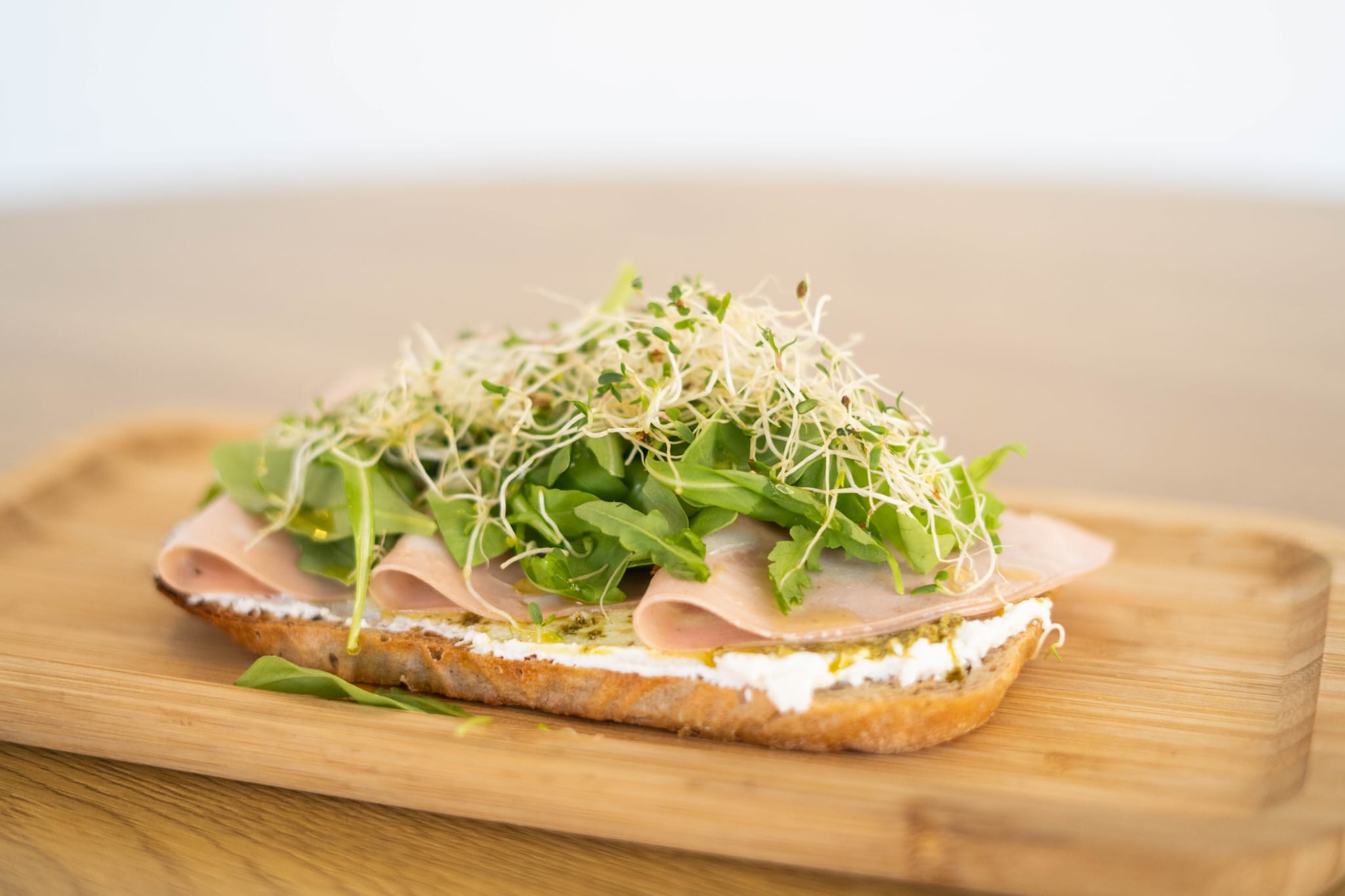 Cremosa ricotta, crema tomate y albahaca, mortadela italiana con pistachos, rúcula y brotes de cebolla. 9 €