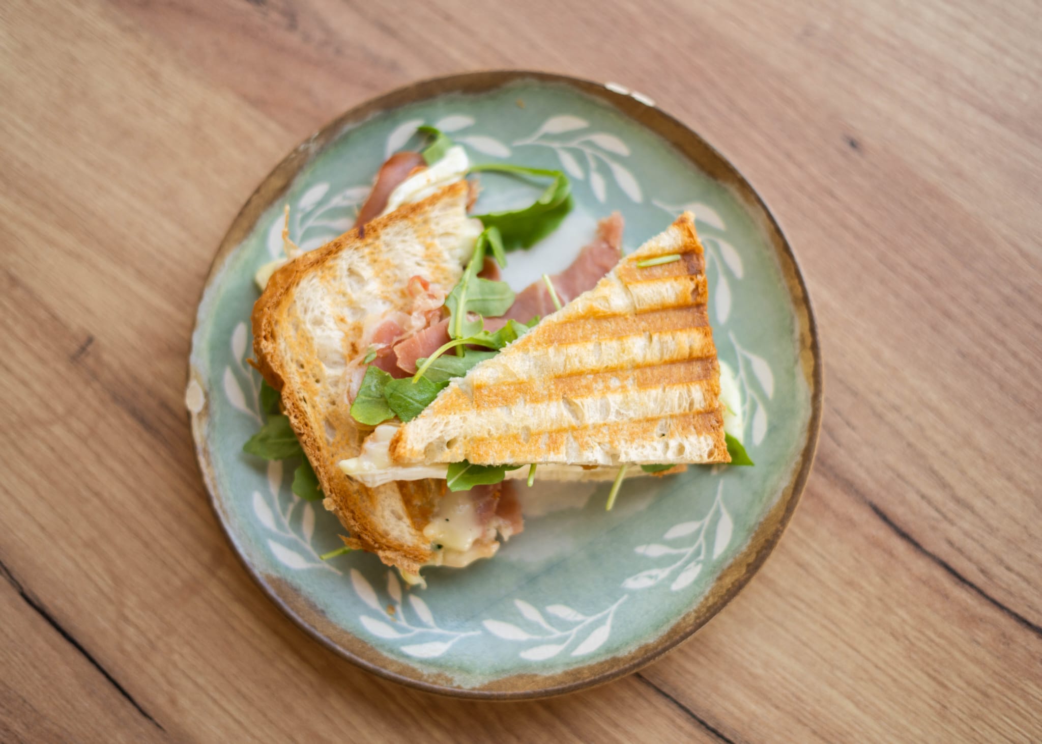 Jamón serrano gran reserva con cremoso queso brie y rúcula fresca. 5 €